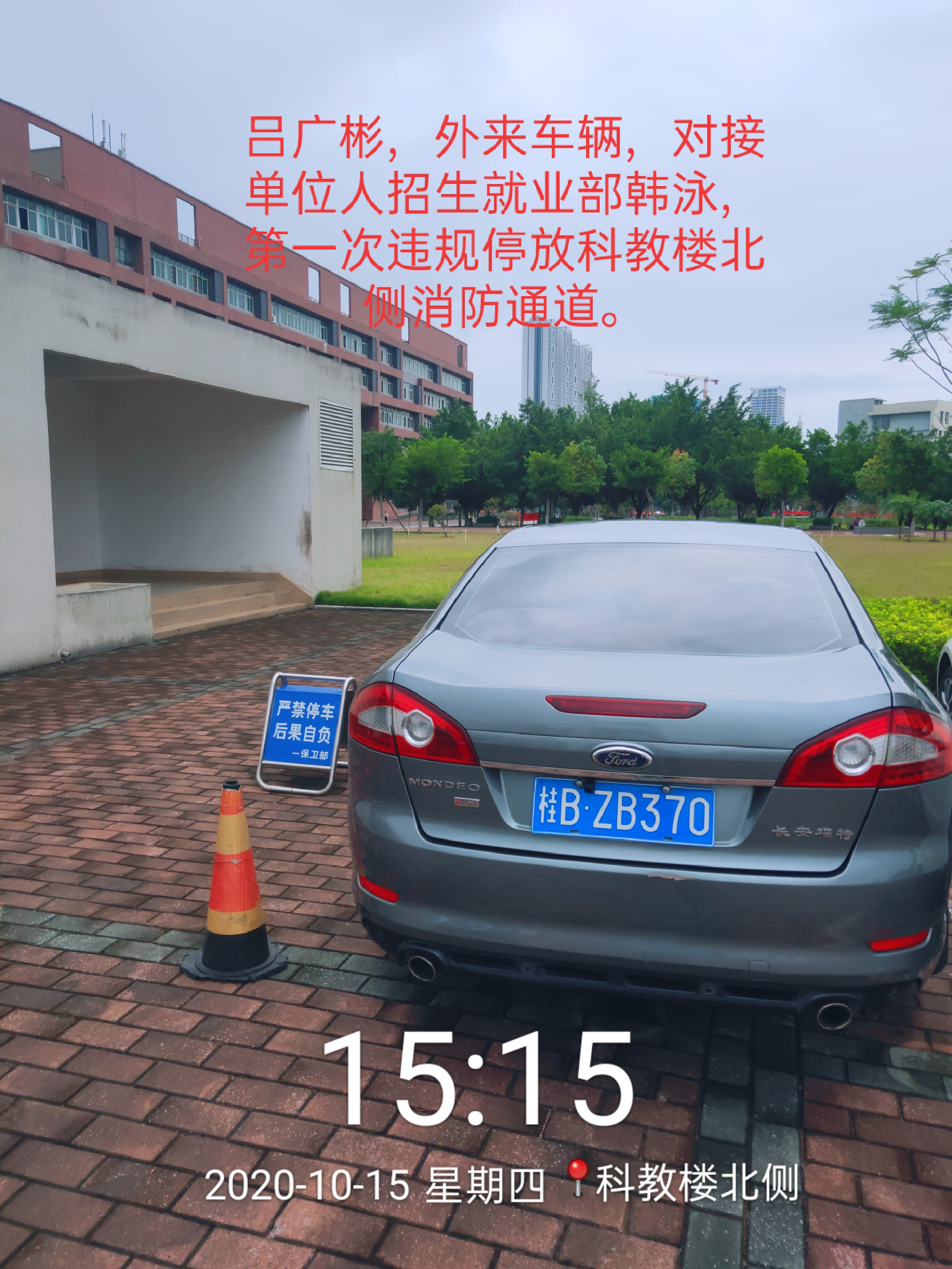 (二)外来车辆,车主:吕广彬,对接单位:招生就业部,违规停放地:科教楼北侧消防通道,违规次数:1次。