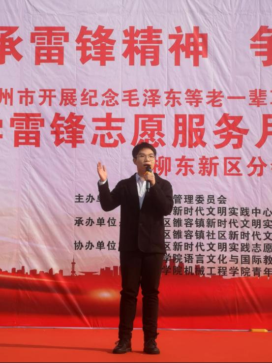 柳东新区党工委副书记、管委会主任刘度量在启动仪式上号召社会各界朋友要认真学习雷锋精神并将其发扬光大,为建设中国特色社会主义社会贡献出自己的精神力量。随后各界志愿服务组织用文艺演出的形式对雷锋同志的精神进行了歌颂,语言文化与国际教育学院学生、新时代大学生宣讲团成员王崇宇进行了题为《雷锋,永恒的精神坐标》的宣讲,赢得现场群众的热烈掌声。