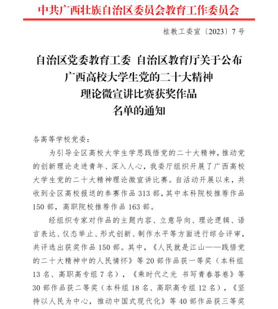 近日,自治区党委教育工委、自治区教育厅公布了广西高校大学生党的二十大精神理论微宣讲比赛的获奖名单。我校荣获优秀组织奖,我校报送的作品荣获二等奖1项、优秀奖2项。