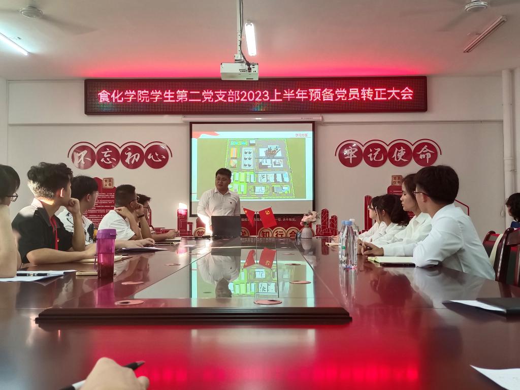 6月4日,食化学院学生第二党支部在党员活动室召开2023年上半年预备党员转正大会。支部书记谢忠振老师、班主任余文娟、学生党员及预备党员30余人参加会议。此次会议由党建助理王昭懿主持。