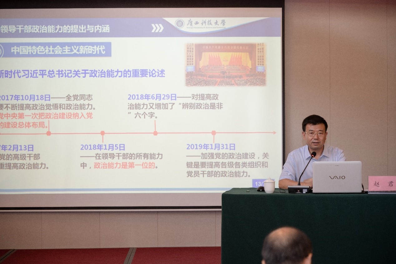 赵君提出了三个观点:一是由党的性质和宗旨决定的。二是由党对领导干部的一贯要求决定的、是由新时代“四个伟大”决定的、是新时代党的建设总要求决定的。他提到,我们党作为马克思主义政党,讲政治是我们党最本质的特征,把重视讲政治、重视干部思想政治素质作为一大传统和优势,把考核领导干部的政治能力作为第一领导能力。他强调,作为新时代领导干部要充分领会党的十九大报告指出新时代党的建设总要求“将政治建设放在统领地位,抓住了全面从严治党的根本性问题”基础上,在统揽“四个伟大”中切实扛起这份沉甸甸的政治责任,解决好时代和实践提出的重大课题。