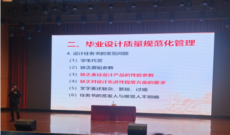 刘教授主要围绕毕业设计在本科教学中的地位与作用、毕业设计质量规范化管理、学生视角下的毕业设计工作步骤与要求及毕业设计的心态管理四个方面进行开展主题分享,并列举一些实例进行分析。